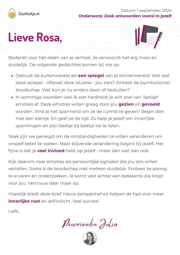 Voel je de innerlijke noodzaak om met jezelf aan de slag te gaan, maar vind je het lastig om dit helemaal zelf te doen? Ontvang op laagdrempelige wijze hulp door mij als penvriendin in te schakelen. Daarbij duik ik dieper in jouw situatie en ontvang je een persoonlijke digitale brief.
